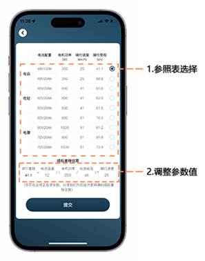 (3) 电池&电机:用于快速配置车辆的电池电压、电池容量、电机功率、骑行速度等参数,这几个参数的准确性会影响到App对剩余电量以及续航里程的估算,如用户对剩余电量及续航里程的估算有较高的准确性要求,则需保证这几个参数的准确性。反之可从参照表中选择相近参数即可;综上,电池电机参数的配置确定,主要为两个步骤:第一步选择参照表,第二步调整底部的参数值,如图5所示:
