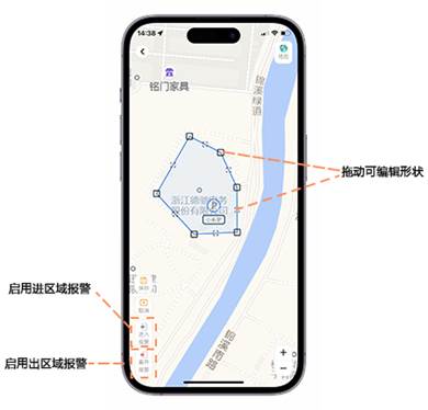 电子围栏配置后可触发车辆的进出区域报警,对用户的日常用车安全起到非常有利的辅助作用。电子围栏功能可通过主界面底部的“电子围栏”功能项进入,电子围栏设置界面如图