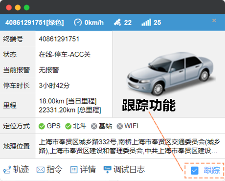 针对已订阅的车辆可追加跟踪功能,跟踪功能位于地图区域,车辆详情面板底部的快捷操作中,勾选快捷操作最右侧的“跟踪”即可开启跟踪功能,如图8所示: