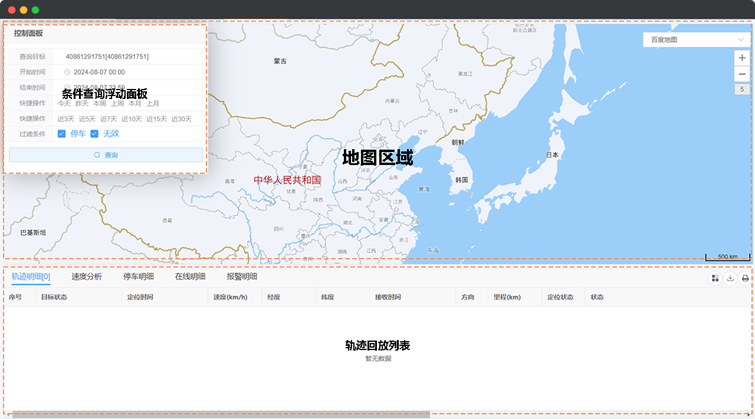 轨迹回放页面由两部分构成:页面上侧的地图区域,页面下侧的轨迹回放列表以及页面左上侧的查询条件浮动面板,如图9所示: