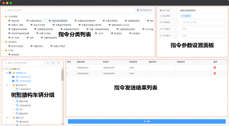 指令下发页面由四部分构成,分别为:页面左上侧的指令分类列表,页面右上侧的指令参数设置面板,页面左下侧的树形结构车辆分组以及页面右下侧的指令发送结果列表,如图14所示: