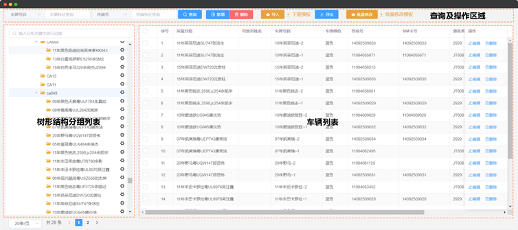 车辆管理页面由三部分构成:顶部查询及操作区域,左侧树形结构分组列表,右侧车辆列表,如图