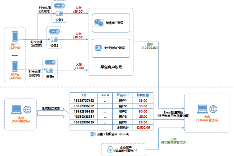 (4) 平台WEB端管理负责人,周期性账户对流水记录生成扣流量卡扣款名单(Excel表格),并在卡商平台上使用流量卡扣款名单进行批量充值操作,此时的充值操作,管理人员可使用企业账户,或其他付款方式进行付款。