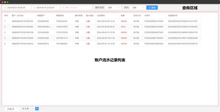 账户流水记录页面由两部分构成:顶部查询区域,以及正中的账户流水记录列表,如图30所示: