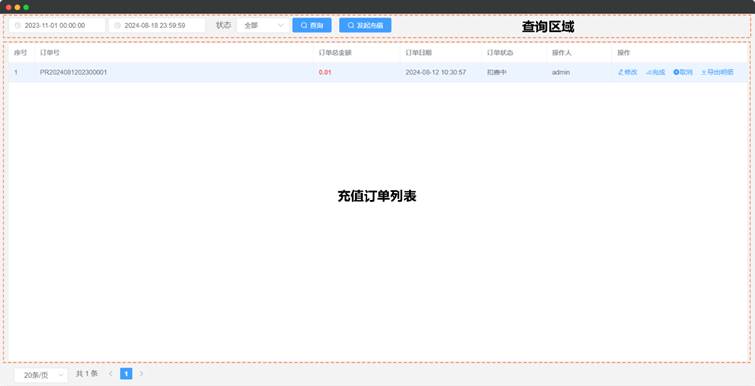 (5) 点击最底部的“保存”按钮,完成“批量充值”订单创建,此时回到外部充值订单列表,可见列表中已生成一条批量充值订单记录,订单状态为“扣费中”;
