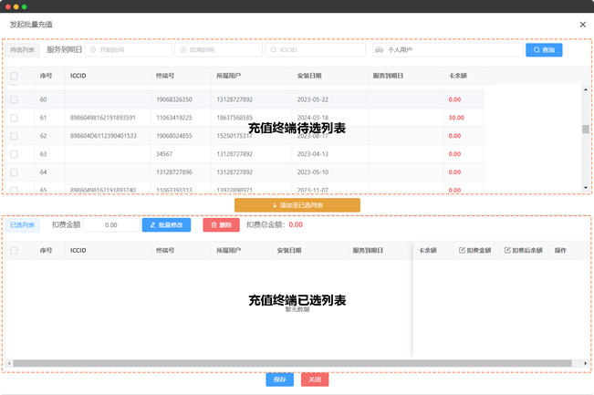 (1) 点击顶部查询区域中的“发起充值”按钮,弹出批量充值对话框,对话框由两部分构成:顶部充值终端待选列表,以及底部充值终端已选列表。通过待选列表与已选列表联动操作完成充值终端筛选,如图31所示: