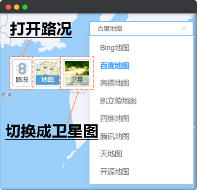 卫星图与路况图可在地图选择操作过程中切换或开启,如图2所示: