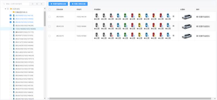 车辆图标设置页面由三部分构成:左侧车辆分组列表,右侧顶部操作区域,以及右侧车辆图标设置列表,如图26所示:
