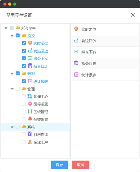 左侧勾选需要常驻至快捷菜单栏中的菜单项,点击底部“保存”按钮,完成设置。