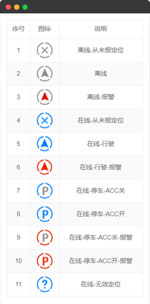 车辆状态图标用于直观表示车辆当前状态,车辆状态图标分为11类,如下表所示